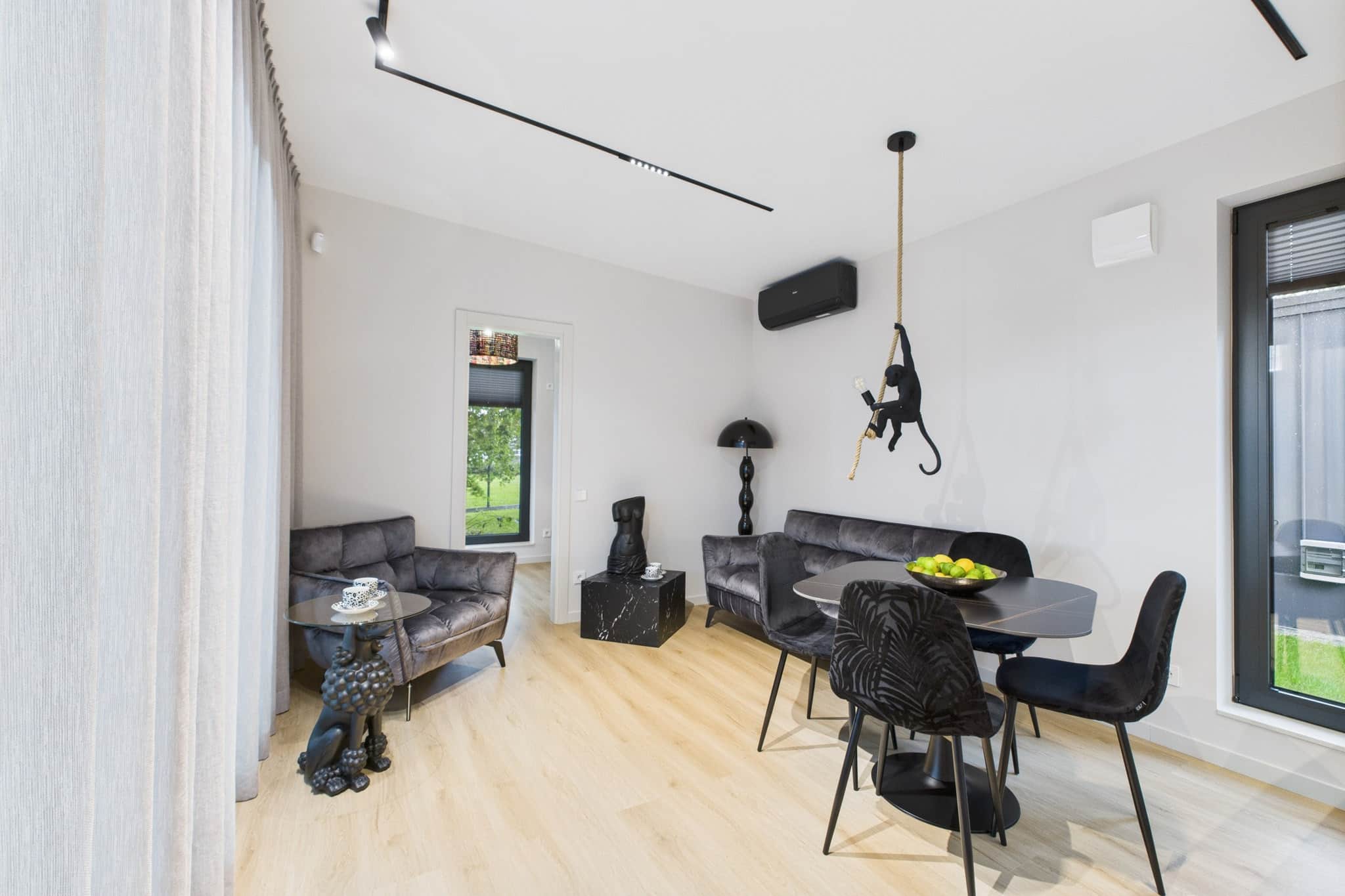 "BLACK" brīvdienu dizaina māja ir estētiski un funkcionāli veidota naktsmītne Siguldas centrā, kur laikmetīgs dizains sastop ar dabas tuvumu. No plašās privātās terases paveras skats uz Siguldas Panorāmas ratu, savukārt gaišais, mūsdienīgais interjers un pārdomātais plānojums nodrošina komfortu jebkurā uzturēšanās laikā. Pilsētas kultūras un atpūtas iespējas ir rokas stiepiena attālumā, taču apkārt valda miers un harmonija, radot ideālu vidi gan īslaicīgai atpūtai, gan ilgākām brīvdienām. 42 m2 māja - viesistaba apvienota ar virtuves zonu, guļamistabas, bērnistaba un ērta vannasistaba. Naktsmītne piemērota diviem pieaugušajiem un līdz diviem bērniem, piedāvājot mierīgu un komfortablu uzturēšanos Siguldas centrā.
